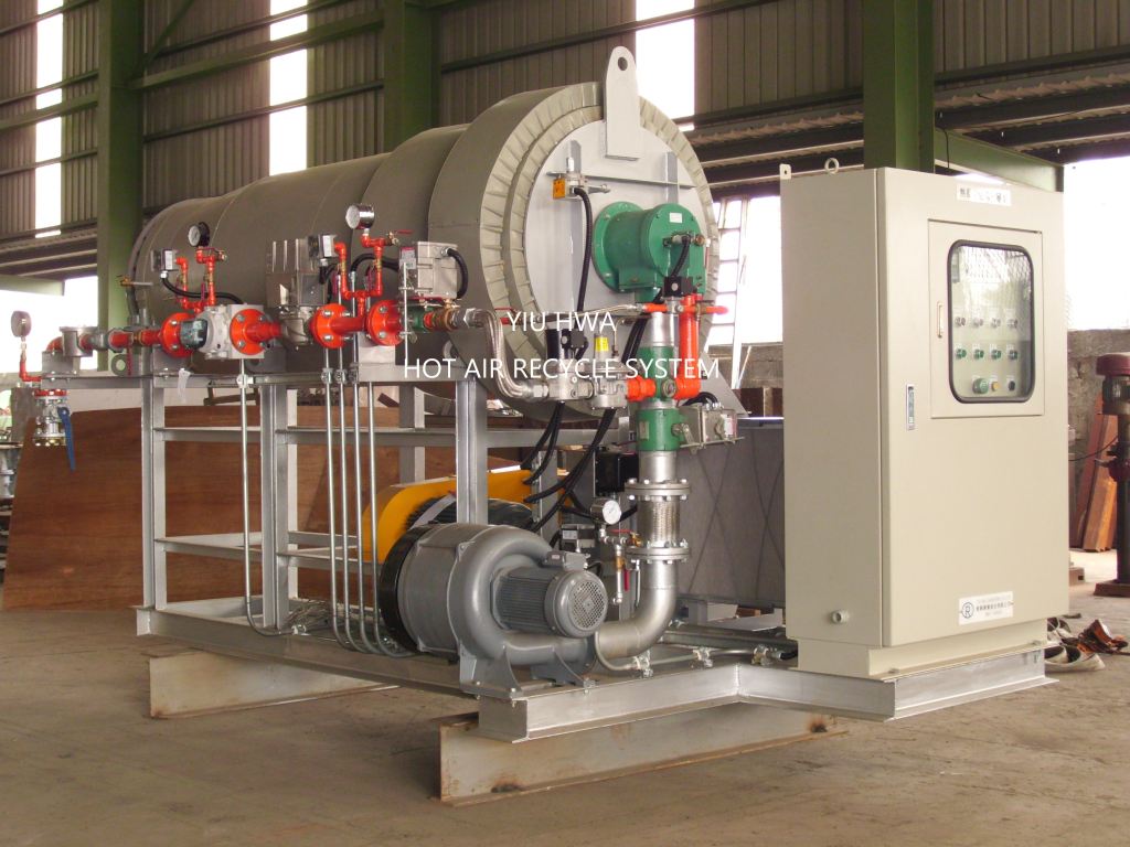 省能型熱風循環系統(中華民國專利證書新型第M413844號專利) 規格: •發熱量:120~1,200kW(10~100×104kcal/h) •風量:50~500m3/min •熱風溫度:80~500℃ •控制方式:開/關或分段控制 特性: •利用燃燒器產生之熱風及廢氣除臭 •適用於烤漆爐、烘乾爐及乾燥爐 •體機小、不佔空間